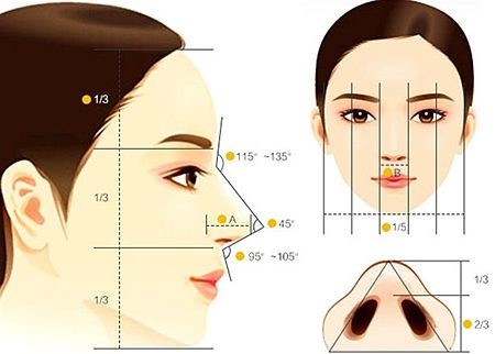 完美的鼻型,應遵守鼻子為面長的1/3,鼻根部寬約1厘米,鼻最大寬度,即兩側鼻翼側緣之間距為鼻長的70%,鼻翼兩側與內眼角成垂直,符合三庭五眼的比例關系。